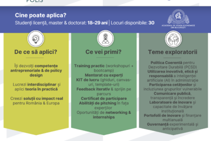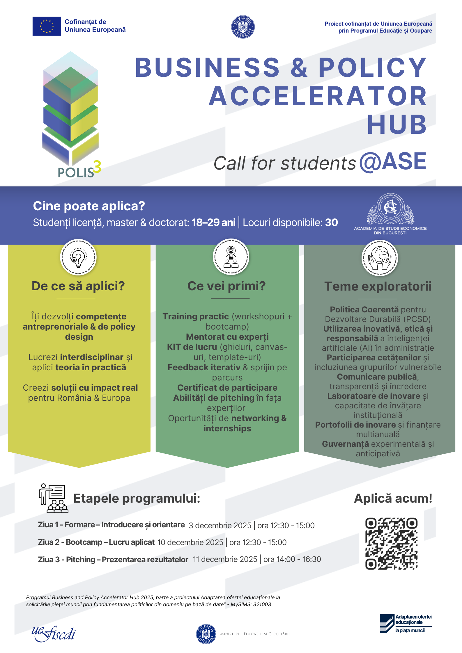 Vă invităm să aplicați pentru Business & Policy Accelerator Hub, organizat de Agenția de Finanțare a Învățământului Superior – UEFISCDI. Veți beneficia de un program intensiv de formare care vă oferă oportunitatea de a dezvolta competențe antreprenoriale și de policy design, aplicate direct în contexte reale.