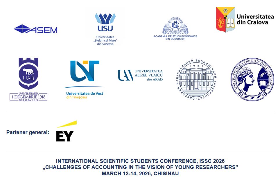 Consistent with its continuous effort to stimulate interest in scientific research among young people, as well as the steps taken to promote and increase institutional visibility, in line with tradition and induced expectations, the ASEM Faculty of Accounting organizes the International Student Scientific Conference (ISSC 2026) with the title The challenges of accounting in the view of young researchers, which will be held in Chisinau, on March 13-14, 2026. The event is aimed for undergraduate and master’s students and aims to achieve a useful exchange of ideas and knowledge transfer, promoting the results of research activities in the hope of stimulating their initiative towards academic level research activity.