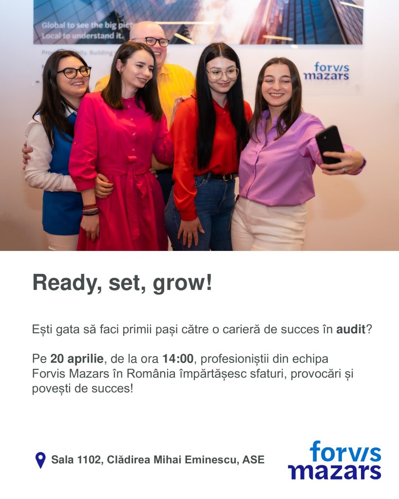 We invite you to participate in the workshop “Ready, set, grow!”, delivered by professionals from the Forvis Mazars Romania team, on 20 April 2026, starting at 2:00 PM, in Room 1102, Mihai Eminescu Building, ASE.